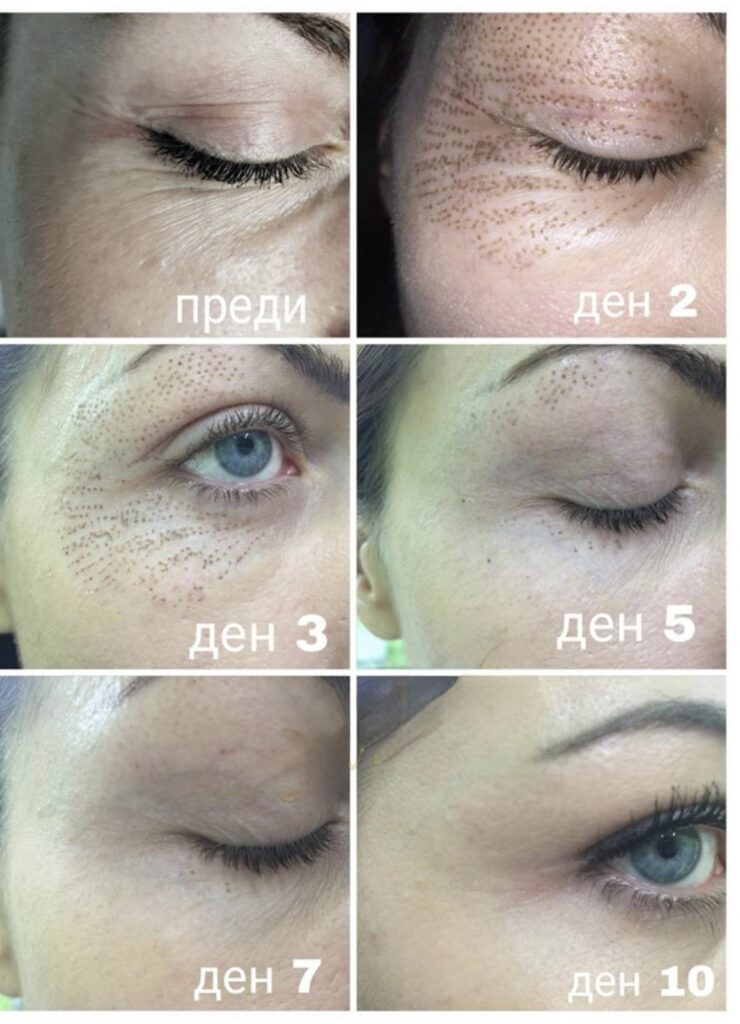 Моля, обърнете внимание, че в първите 2-3 дни след манипулацията, при някои пациенти има оток в областта на очите, когато е обработвана тази зона. В някои случаи, в зависимост от метаболизма и кожата на пациента, крустичките може да се задържат над 10 дни (14 или повече) , но това са редки случаи. Ако при Вас се случи така, важно е да не ги насилвате и отстранявате насилствено. Също така, при по-тънка и чувствителна кожа е възможно мястото след падане на крустите да е по-зачервено и новата тъкан да е с различен цвят. Изравняването на текстурата и цвета на стара и нова кожа е възможно да стане по-бавно при някои пациенти (няколко месеца), като в този период се използва слънцезащитни и хидратиращи продукти с фактор 50+. Пациента може да поставя декоративна козметика (фон дьо тен) без проблем (след опадване на крустите!).
